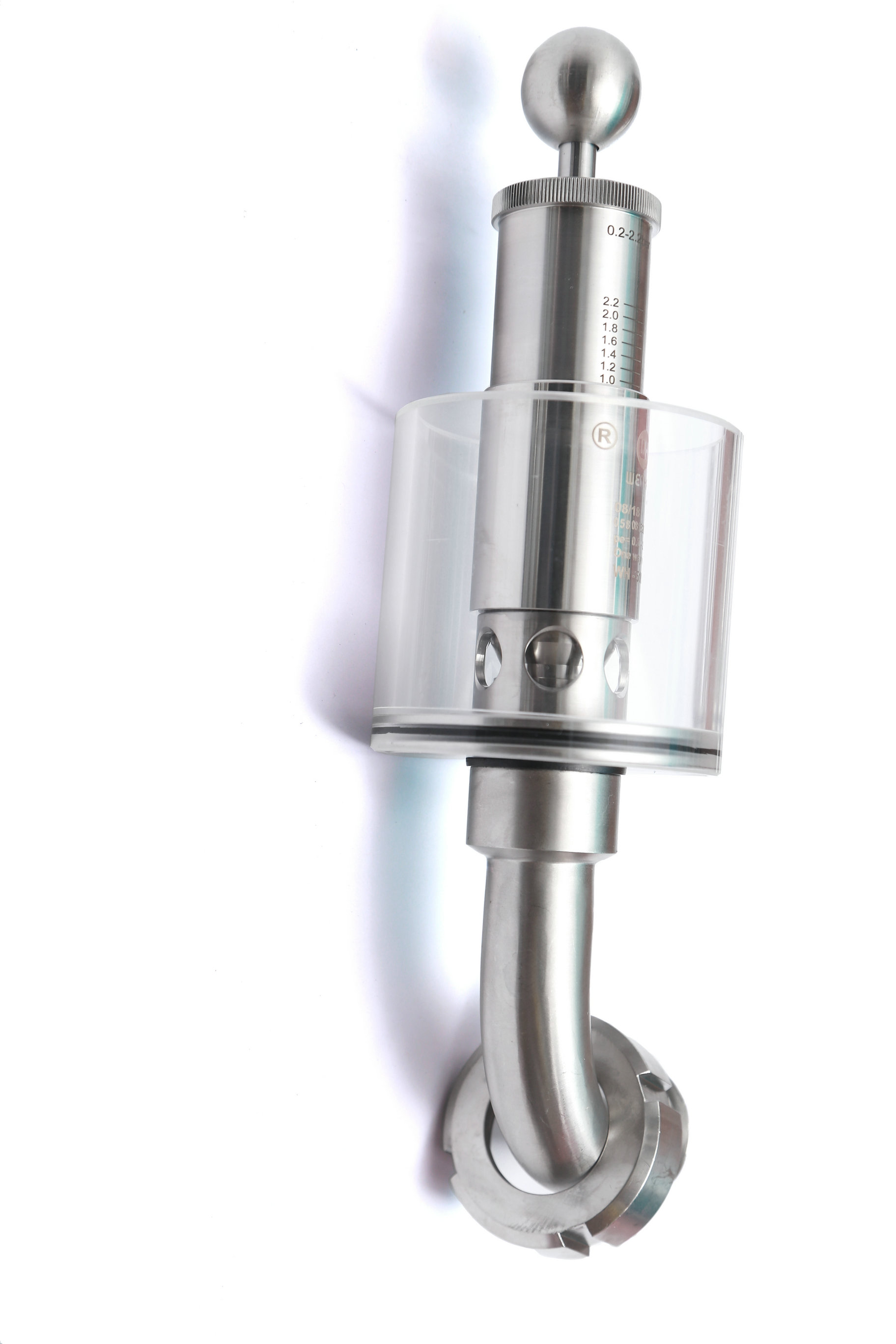 該閥門應用于壓力容器式管路系統上 調節單向排氣閥保護容器壓力過高防爆作用,當壓力高于設定壓力(標準1BAR)時可以排氣,反之關閉,調節桿標上壓力刻度,所需壓力按刻度上調整,該閥門使用方便,刻度準確,玻璃罩加水能看到發酵效果,減少染菌。同時也可以滿足于各種生產工藝需求,適用于各種食品加工,啤酒,飲料以及制藥等各種工業領域。